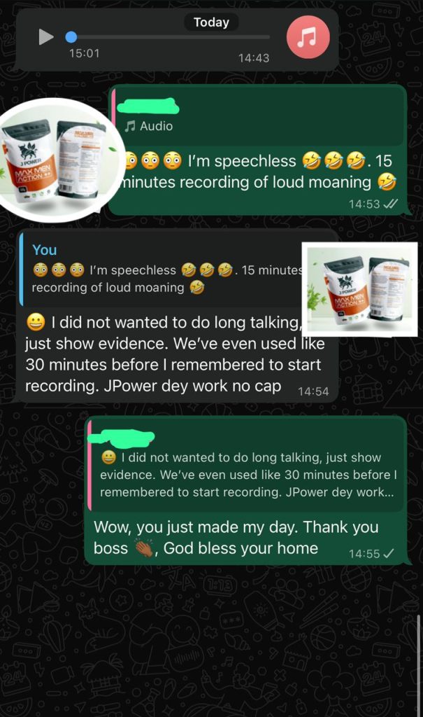 Instead of crashing after your first effort, JPOWER MAX MEN ACTION++ is what you need to become a commander in chief in the bedroom. With JPOWER you will get the strongest erections, last for over 30 minutes or more and not get tired at all anytime you are having sex with a woman.